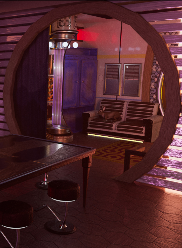 This scene is the apartment for a character in a sci-fi series I am working on, the character is named Dr. Mot. The entire surface of this planet is multiple layers of cityscape.